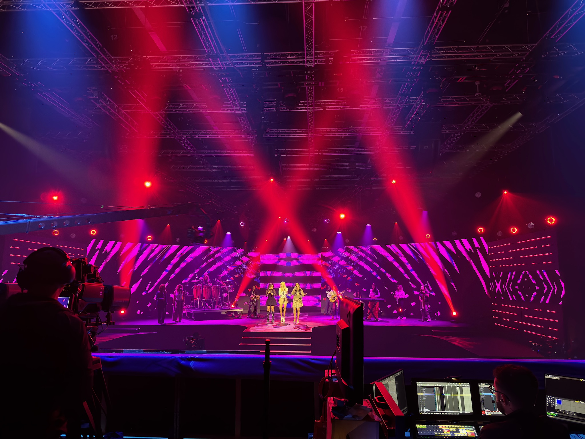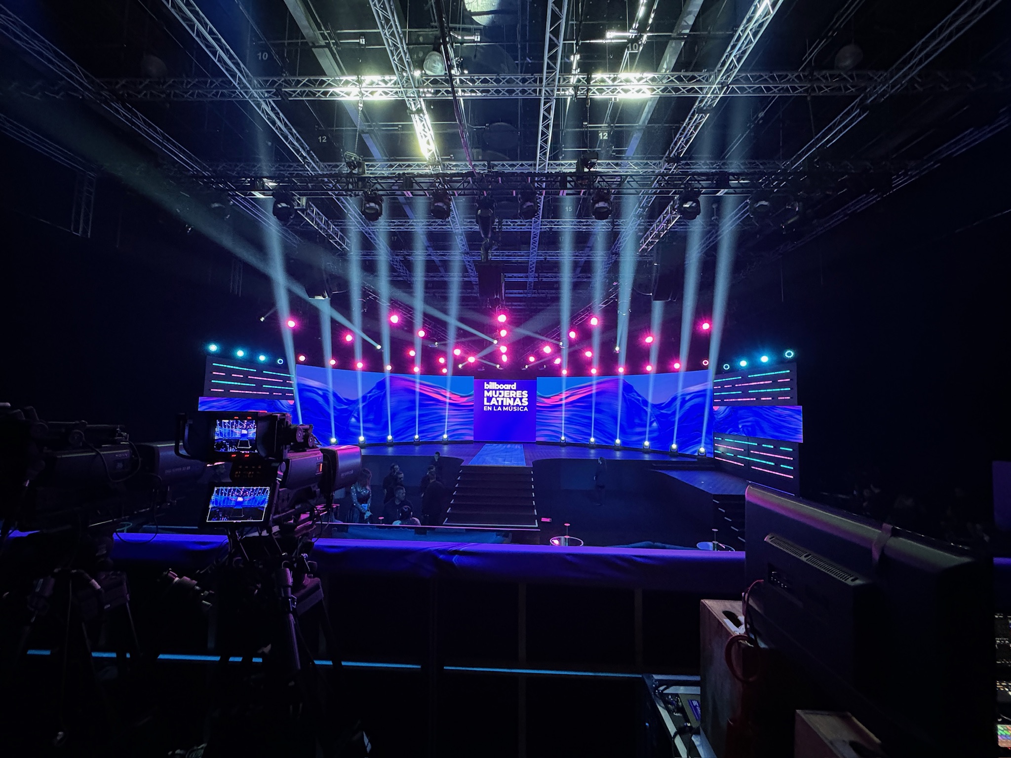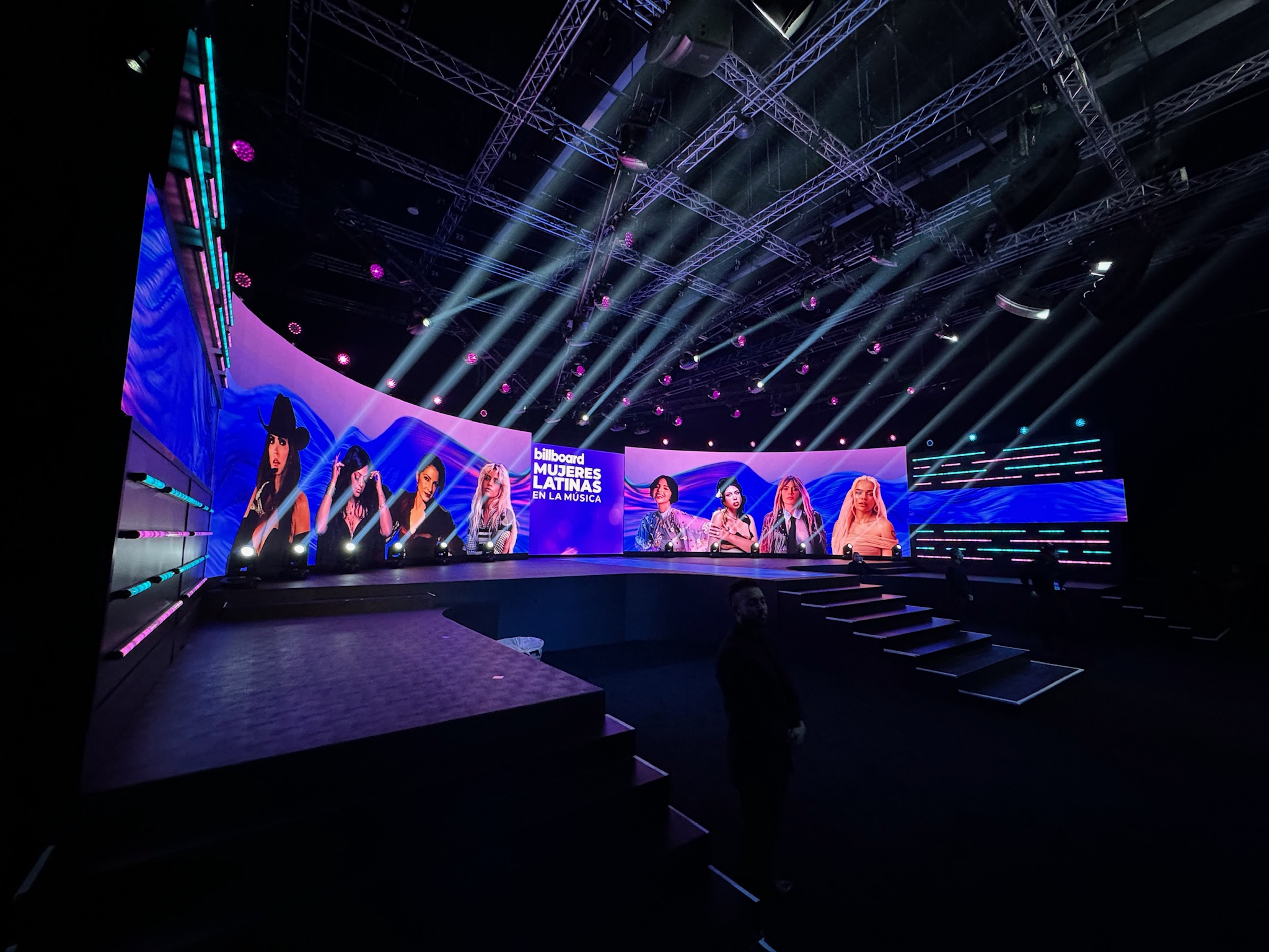 For this production, we were tasked with designing and delivering a visually immersive stage environment for the Billboard Mujeres Latinas. We engineered and installed a curved panoramic LED display to create a seamless visual canvas, ensuring the content wrapped the stage with depth and continuity. We programmed a layered lighting system featuring aerial beams, audience washes, and show-focused accents. Our team executed the rigging and technical integration, coordinating all elements to elevate the visual impact of the event.